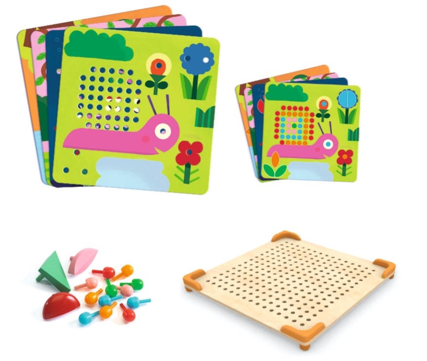 Mai este și partea de organizare în spațiu. Chiar dacă pare doar o planșă cu găurele, copilul învață să se orienteze: sus, jos, stânga, dreapta, mijlocul imaginii. Când urmărește modelul de la Djeco, începe să observe că anumite culori se adună într-o zonă, că anumite forme se repetă. Creierul lui începe să recunoască tipare, să „citească” imaginea, nu doar să vadă puncte colorate. Acesta este un pas important pentru felul în care, mai târziu, va înțelege literele, cifrele și schemele simple.