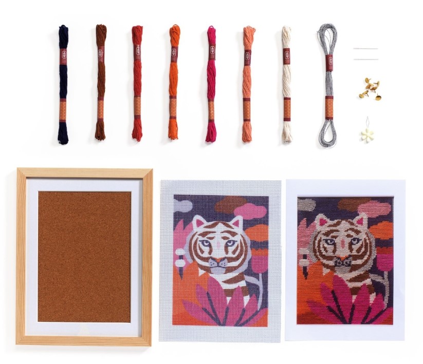 Conținutul este complet și bine gândit: pânză imprimată, 8 x 15 metri de fire colorate, două ace pentru broderie, dispozitiv pentru introdus ața în ac, ace de fixare, ramă de lemn pentru expunerea lucrării, plus pliant explicativ și card cu cod QR pentru tutorialul video. Practic, ai tot ce îți trebuie într-o singură cutie, fără să fie nevoie să cauți separat alte materiale. Calitatea pânzei și a ramelor, precum și faptul că materialele sunt certificate FSC, arată că Atelier creativ 64 Goblen si broderie, Djeco este un kit de nivel bun, gândit să arate bine și după ce lucrarea este terminată și pusă pe perete.