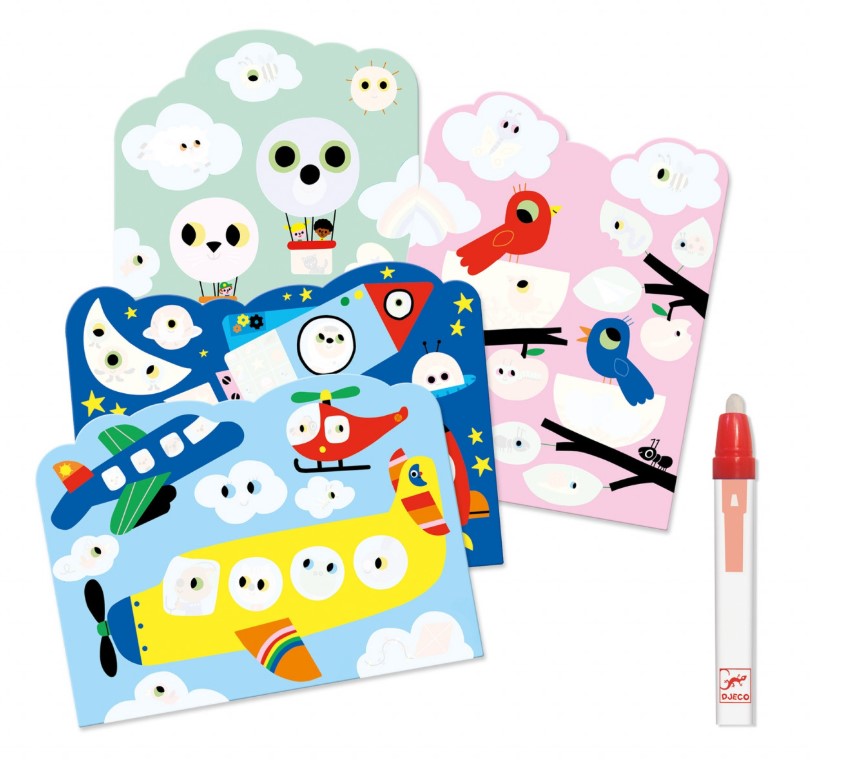 Setul de pictură cu apă „Zbor”, Djeco, este format din cartonase cu desene care prind viață atunci când copilul le colorează cu un marker special umplut doar cu apă. La început, pozele par simple și destul de fade. Dar, în momentul în care copilul plimbă markerul peste ele, apar culori și detalii ascunse. Când foile se usucă, revin la starea inițială și jocul poate fi reluat de câte ori vrea. Asta înseamnă că nu ai nevoie de vopsele, nu ai nevoie de pahar cu apă și nici de șorț special.