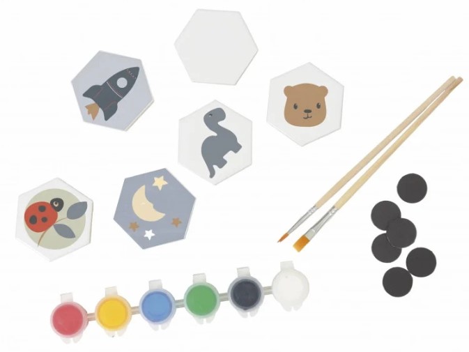 Jocul cu magneți ceramici e genul acela de activitate liniștită, dar plină de sens. Copilul are la dispoziție 6 plăcuțe ceramice albe, în formă hexagonală, pe care le poate picta cum vrea el. Setul include și 6 magneți, 6 tuburi de culori diferite și două pensule – una mai subțire pentru detalii și una mai lată pentru a acoperi rapid fundalul. Practic, are tot ce îi trebuie într-o singură cutie ca să creeze mici “tablouri” pe care apoi le poate pune pe frigider sau pe o tablă magnetică.