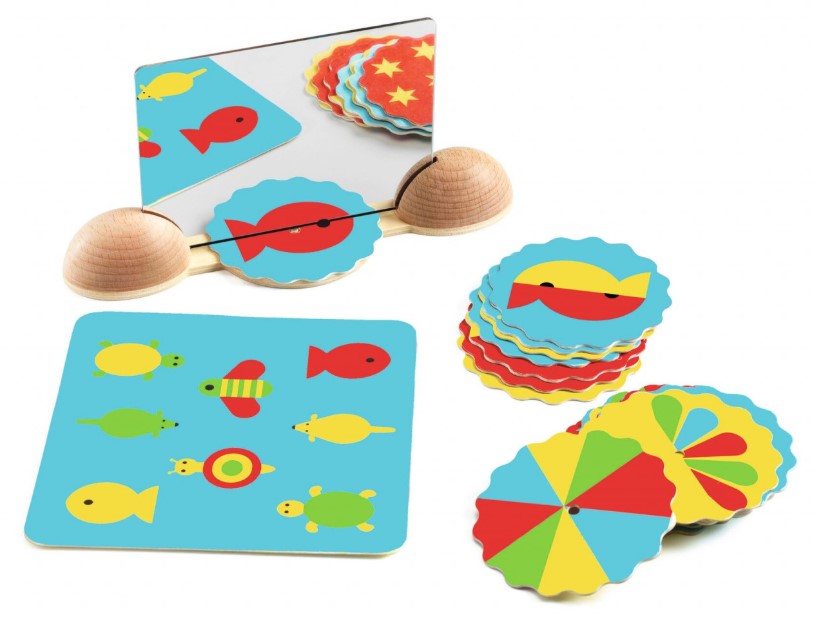 Jocul creativ cu oglinzi Ze mirror Images este un joc care pare simplu la prima vedere, dar îi prinde imediat pe copii. Setul conține o bază din lemn, o oglindă din plastic, 20 de cartonașe rotunde și 4 cartonașe mari. Copilul pune imaginea sub oglindă și începe “magia”: rotește cartonașul până când imaginea reflectată se potrivește cu modelul de pe unul dintre cartonașe. Totul se întâmplă prin joc, dar în spate se află exerciții serioase de atenție și logică.