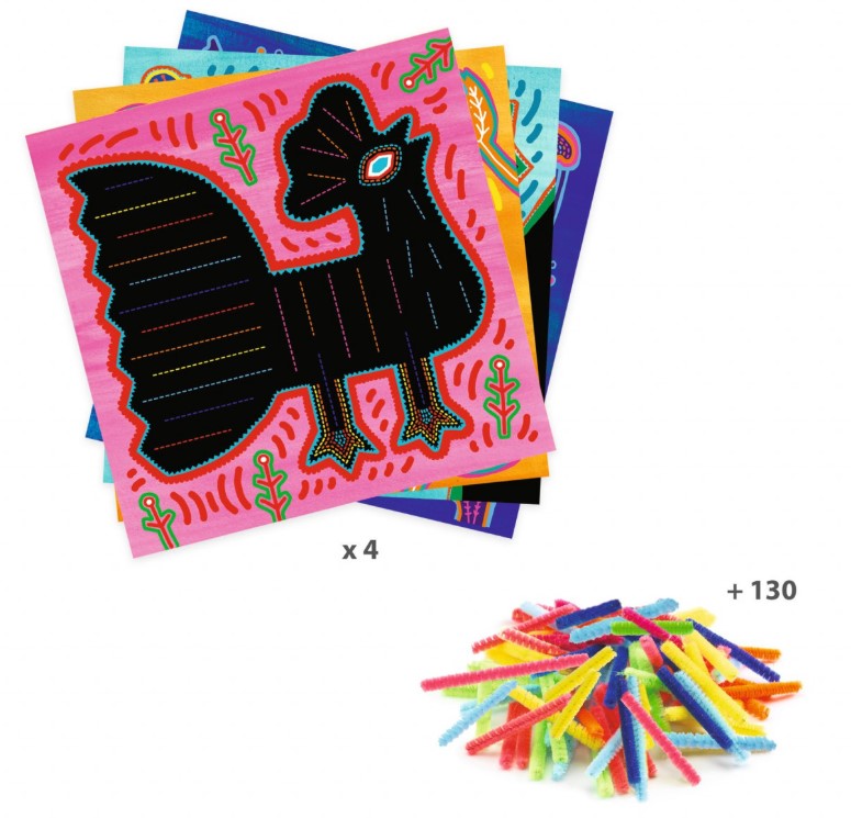 Tablourile cu sârmă plușată Super soft de la Djeco sunt o activitate foarte plăcută pentru copiii de 4 ani, mai ales pentru cei care iubesc culorile și lucrurile “pufoase”. În set sunt 4 planșe din carton gros, perforate și deja ilustrate, plus peste 130 de fire plușate, în două dimensiuni și o mulțime de culori. Copilul trebuie să treacă firele prin găurile mari de pe planșe, urmând modelul sau inventând propriul design. Rezultatul este un tablou texturat, moale la atingere, care arată ca o mică operă de artă.