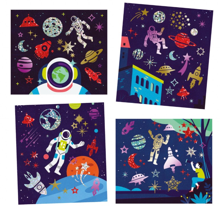 Setul creativ transfer Cosmos este o activitate artistică “curată”, fără vopsele sau lipici care să ajungă peste tot. Copilul are la dispoziție 12 imagini cu tematică spațială – planete, rachete, astronauți, galaxii – și foi metalice strălucitoare în mai multe culori. El alege o imagine, o aplică pe un suport și, printr-un mic gest de “radere” sau frecare, desenul se transferă pe fundal. Apoi adaugă foile metalice pe zonele lipicioase, iar imaginea capătă reflexe lucioase, ca un poster spațial în miniatură.