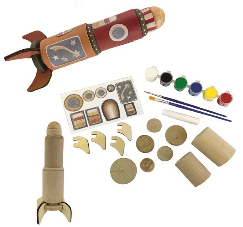 Setul de pictat cu rachetă vine cu piese din lemn natur, o pensulă, acuarele și stickere pentru detalii. Copilul primește racheta “goală”, fără decor, și are libertatea să o picteze exact cum dorește. Poate să aleagă culori puternice, poate să facă dungi, stele, buline, apoi să adauge stickere ca să pună accent pe anumite zone. La final, asamblează racheta și o poate folosi fie ca decor în cameră, fie ca jucărie în jocurile lui de imaginație.