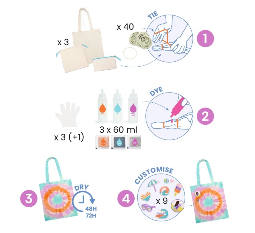 Jocul creativ DIY Raza de soare, Djeco este perfect pentru copiii care adoră să își pună amprenta pe tot ce poartă. În loc să primească un accesoriu gata făcut, copilul creează singur modele colorate, cu efect de tie-dye, pe accesorii din bumbac special pregătite. Pentru un copil de 9 ani, faptul că poate transforma niște piese simple în obiecte pe care chiar le poate purta sau folosi la școală este mult mai interesant decât un simplu set de colorat, iar acest lucru îl așază clar în categoria de jocuri creative pentru copii de 9 ani cu impact real în viața de zi cu zi.
