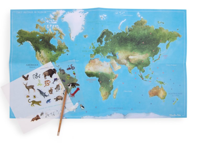 Jocul de transfer Harta lumii, Moulin Roty este genul de produs care îi face pe copii să uite că „învață geografie”. Pentru un copil de 9 ani, un poster mare cu harta lumii și 107 animale de transferat devine mai mult decât o hartă, devine o scenă pe care o umple singur, pas cu pas. În loc să privească o imagine tipărită gata, copilul construiește propria hartă, alege unde așază fiecare animal și începe natural să pună întrebări despre continente, țări și habitate. Asta îl așază perfect în categoria de jocuri creative pentru copii de 9 ani care combină informația cu jocul activ.