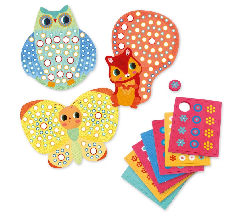 Pentru cei mai mici, cam de la 3 ani, sunt ideale mozaicurile cu piese mari, groase, ușor de prins. De multe ori sunt autocolante din spumă, care se dezlipesc ușor și se lipesc pe planșe cartonate groase. Exact genul de joc “mozaic pentru cei mici”, unde copilul decorează prăjituri, animale sau alte imagini simple, fără reguli complicate. Piesele sunt mari, vizibile, iar riscul să le scape sau să se frustreze este mult mai mic.