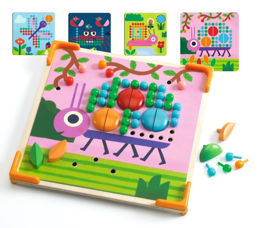 Un prim model foarte des întâlnit este mozaicul cu pioneze colorate. Copilul are o tablă din plastic cu găurele și un set de piese rotunde, în culori diferite. Uneori are și planșe cu modele: animale, mașini, flori. El pune planșa sub tablă, vede desenul prin găuri și începe să înfigă pionezele acolo unde trebuie. Este un tip de joc foarte potrivit pentru copiii de 3–5 ani, pentru că piesele sunt destul de mari, se prind ușor, iar rezultatul apare repede. În plus, copilul poate renunța la model și să creeze singur modele libere, doar jucându-se cu forme și culori.