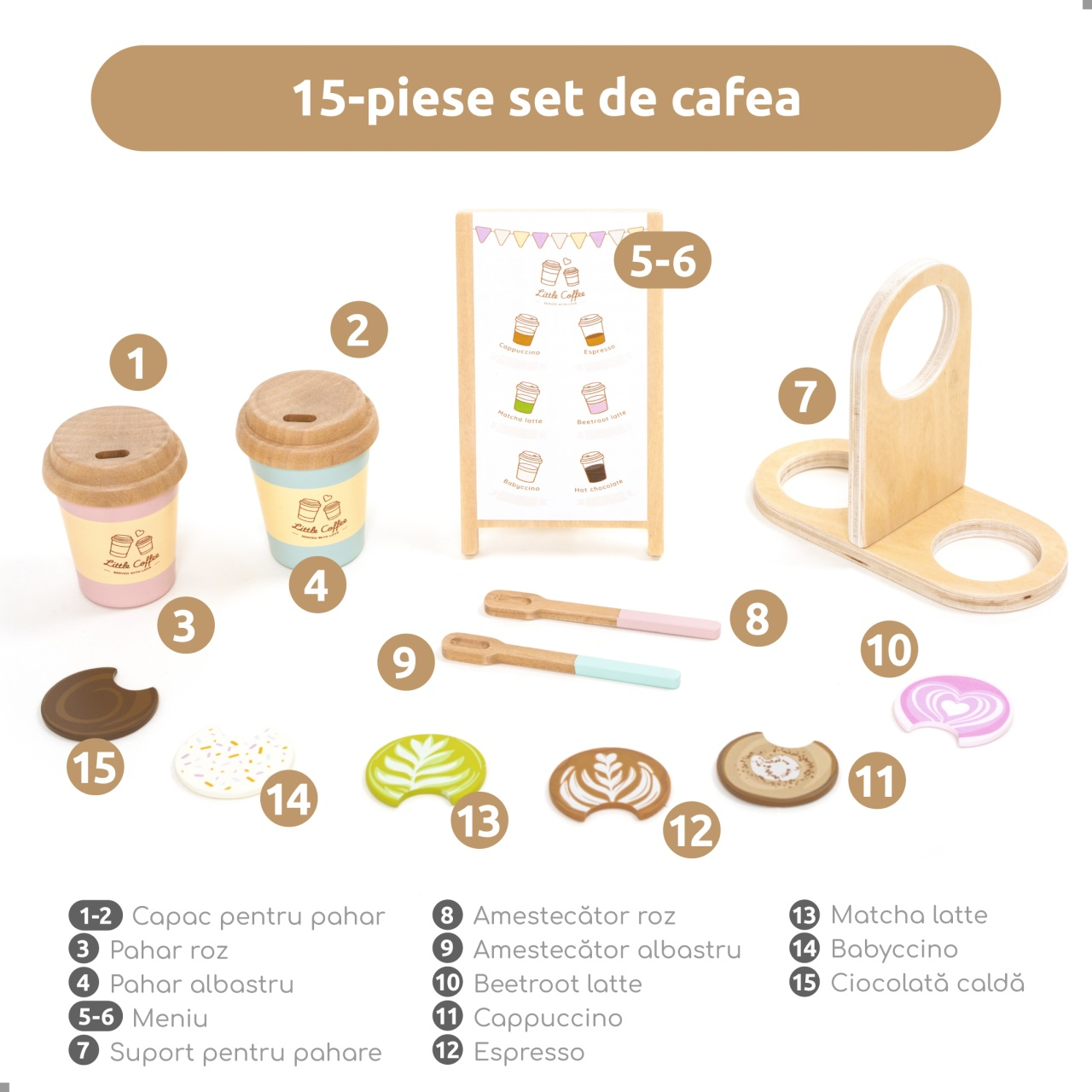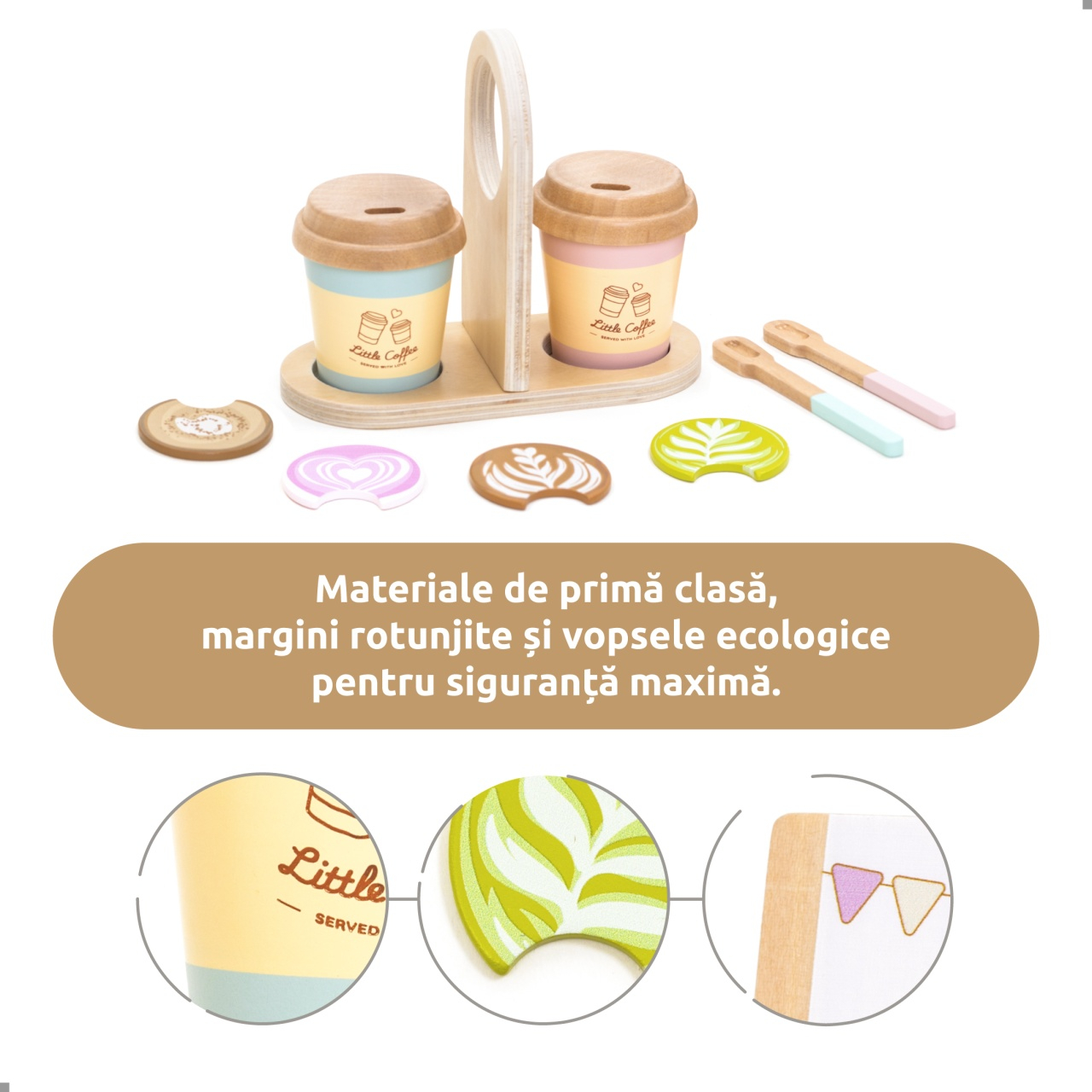 Transformă joaca într-o experiență de cafenea autentică cu setul „Coffee to go - Barista”. Special creat pentru copiii care adoră jocurile de rol, acest set din lemn îi invită pe cei mici să pregătească, să servească și să ofere „cafele” exact ca într-o cafenea modernă. Cu piese realiste și culori vesele, joaca devine mai captivantă, iar imaginația are loc să creeze nenumărate scenarii.