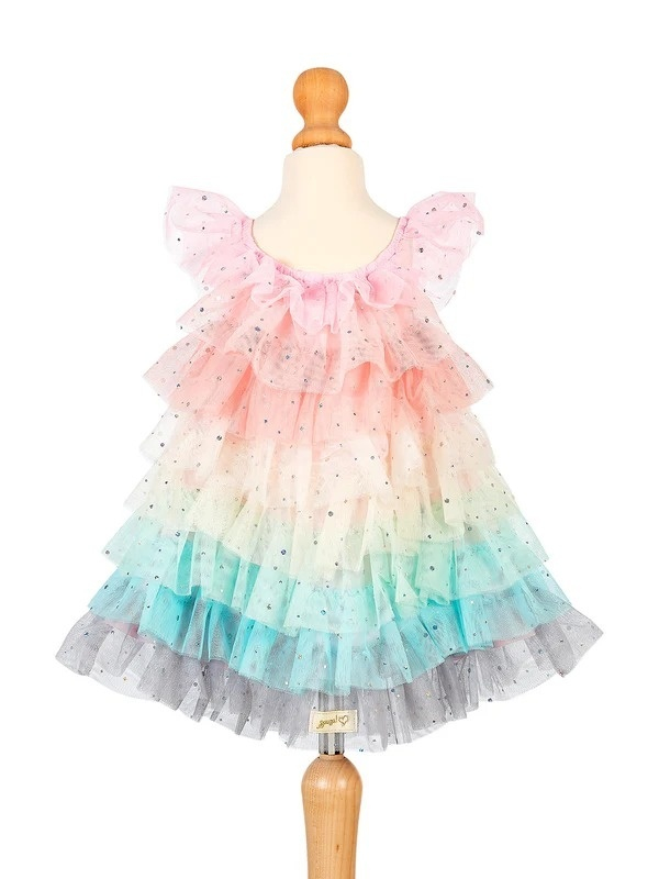 Rochița colorată pentru fetițe Souza! este o piesă veselă, diafană și spectaculoasă, perfectă pentru momentele în care orice ținută trebuie să aducă un strop de magie. Realizată din tul ușor, cu volane suprapuse în degradeu curcubeu, rochița combină nuanțe delicate de roz pal, piersică, galben, mint, turcoaz și gri la bază.