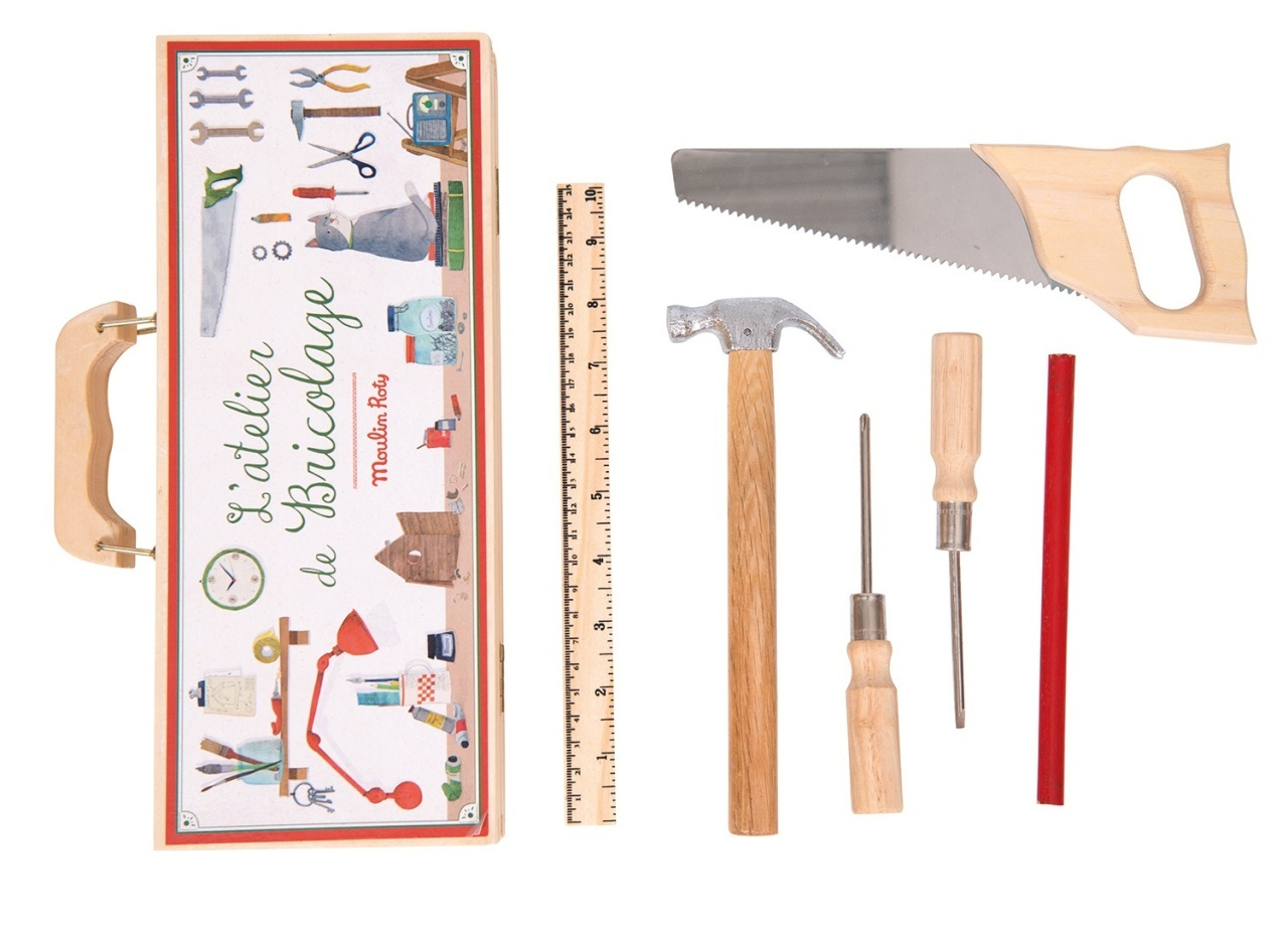 Cele 6 unelte sunt realizate din lemn masiv și oțel și sunt păstrate ordonat într-o valiză din lemn, practică și ușor de transportat. Fără piese din plastic, acest set oferă o experiență autentică și durabilă.