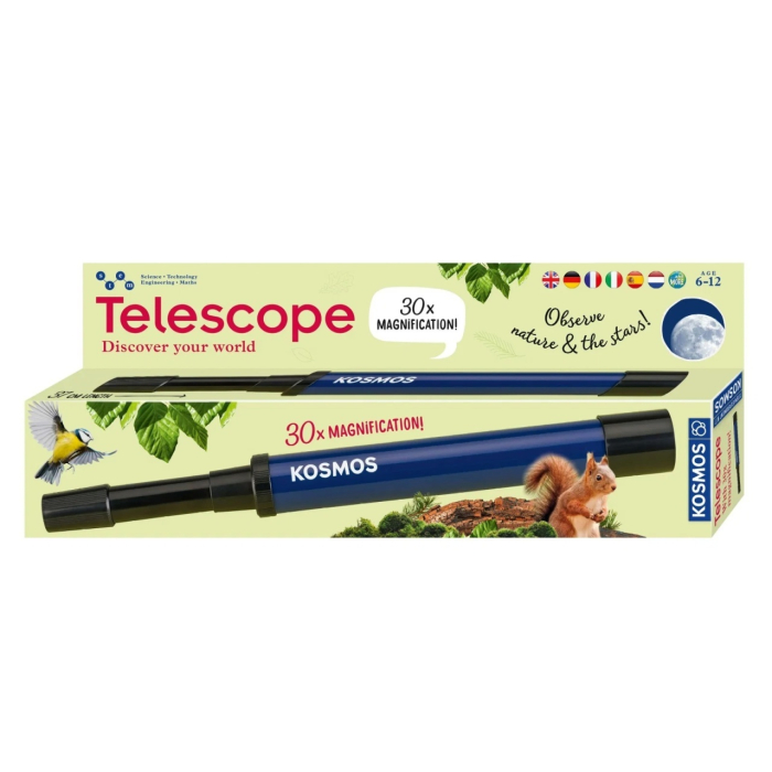 Telescopul pentru copii 30x Kosmos este alegerea potrivită pentru micii exploratori curioși să descopere lumea de aproape și cerul de departe. Cu o mărire de 30x, copiii pot observa Luna, constelații de bază, păsări în zbor, ambarcațiuni pe apă sau alte detalii aflate la distanță.